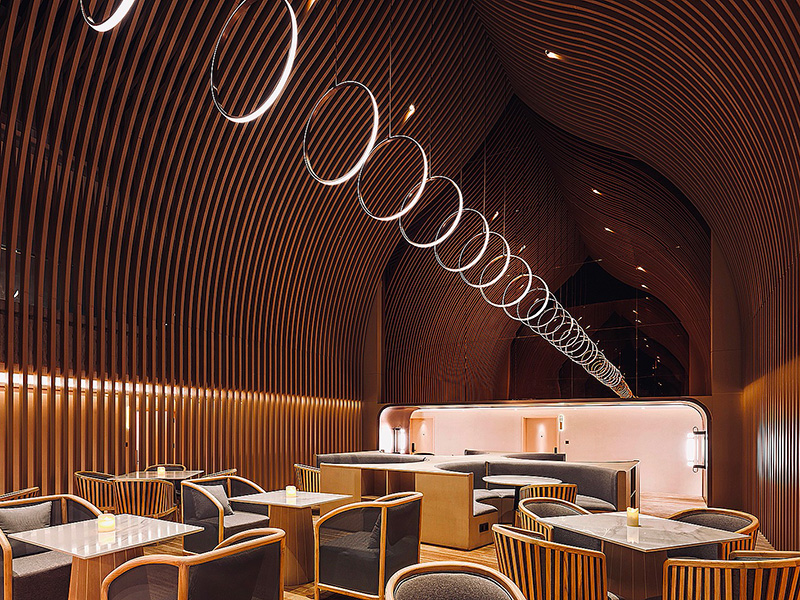 顶层的Sky Cafe用竹材建构了一个略有禅意似教堂的空间, 白天自然光穿过天窗落在座位中间,明亮而愉悦。 晚上,垂吊的圆形LED灯仿佛挂在空中的月亮, 给人一种富有诗意的空间体验。