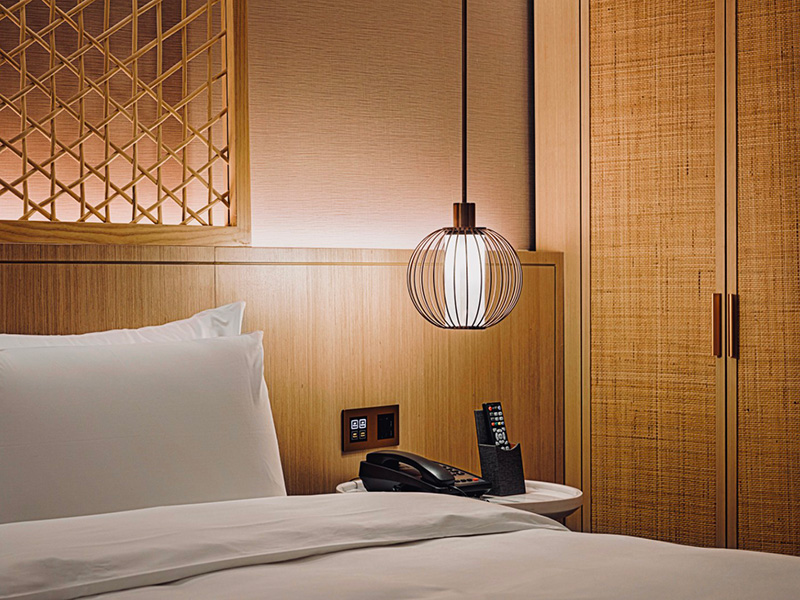 客房床头的竹编造型跟大堂的互相呼应, 背后灯槽的光影让它好像要浮起来一样, 配上温馨的灯光营造出了一个宁靜优雅的休息氛围。