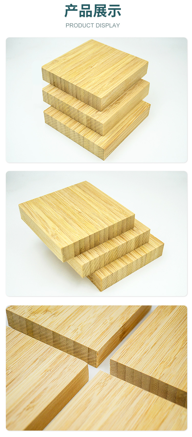 侧压竹板, 竹侧压板又叫竖拼竹板,竹竖拼板,采用优质楠竹竹片,经高压炭化处理,杀虫、去虫卵、去除糖分、淀粉等,再用太尔胶粘合,确保竹板内外密实,板面色泽鲜亮、竹纹清晰,具有韧性好、承重强、不易变形干裂、耐磨、耐用等特点,可用于建材、各类家具、室内外装饰材料、工艺包装、家具板、玩具板、运动器材等。